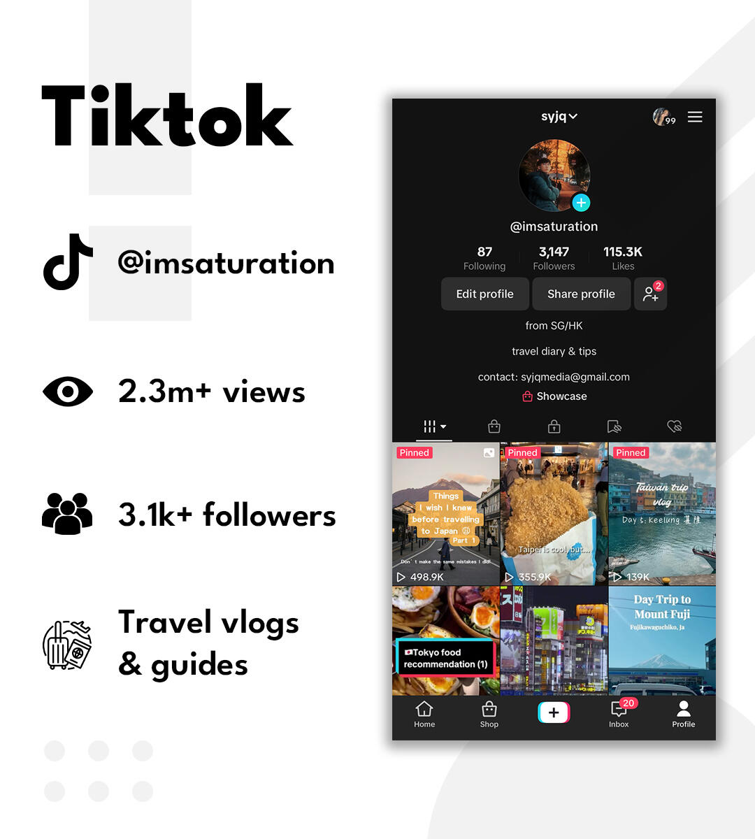 As one of the fastest-growing social media platforms globally, it is naturally the most ideal platform to dive into as a content creator in 2023. As an avid traveler, I share both my experiences and guides on travel on TikTok. Picking up on trends and popular content in my niche and recreating them with my content, I have been able to amass over 2 million views and over 115k likes.Although this isn’t much compared to other popular creators, this has been a good learning experience thus far, seeing that this is my first venture into short-form video content. In 2024, I’m looking to continue growing this account and further develop my content strategies to better grow my following and engagement.