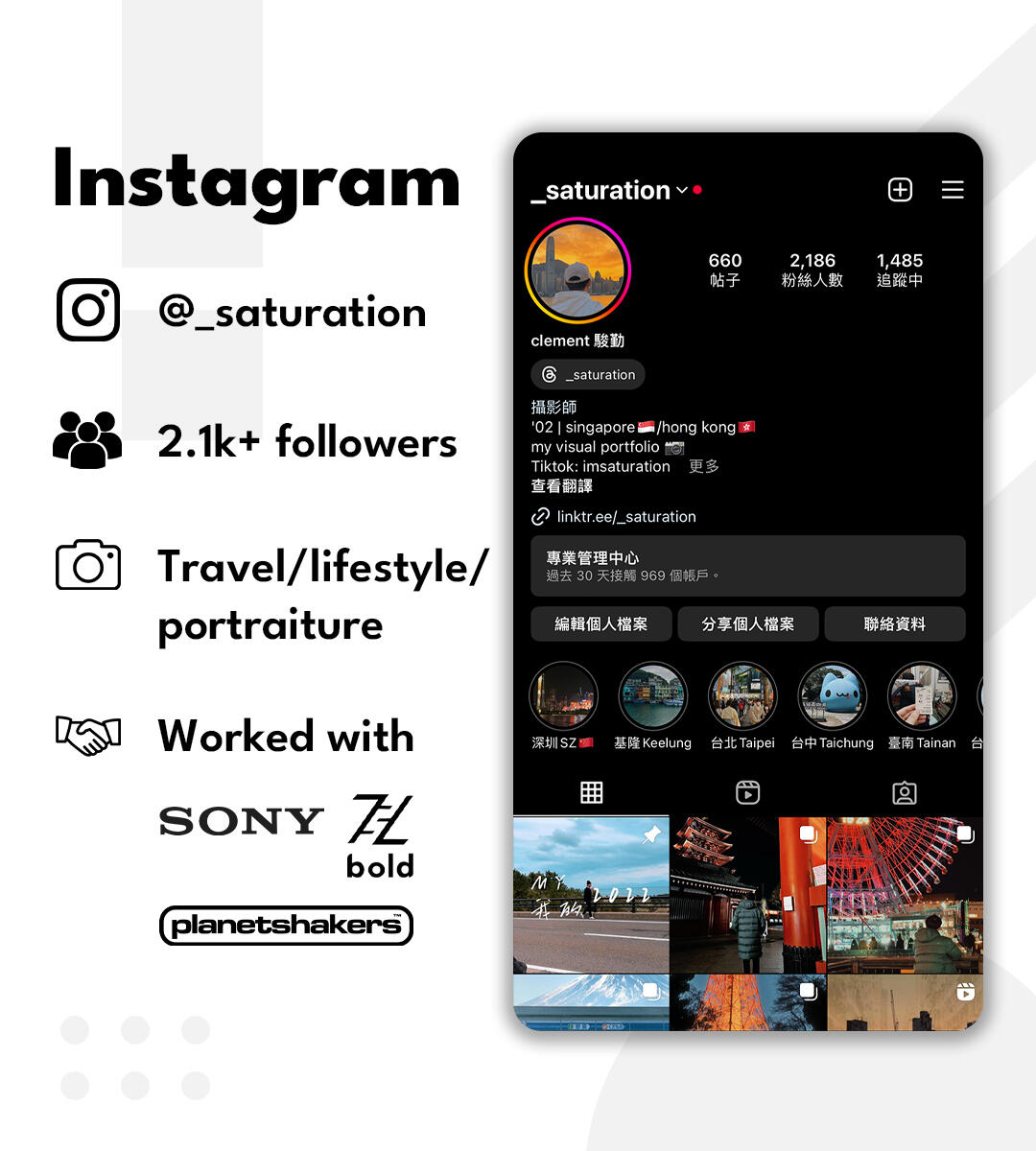Instagram is where my photography journey began. Initially posting street photography, I then delved into travel, portraiture and lifestyle photography. Aside from growing my following and improving engagement rates, Instagram was vital for me to network and meet other like-minded creators.Collaborations wise, Instagram enabled me with collaboration opportunities including testing out Sony’s Alpha 7C mirrorless camera on launch, working with The Bold Company on photos and post for their backpack and being part of the photography team for Planetshakers’ 2019 concert in Singapore.